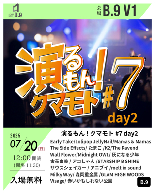 【演るもん!クマモト #7 day2】 出演:Early Take、Lolipop JellyNail、Mamas & Mamas、The Side Effects、たまご、K2、The Ravend'、Wall Flower、Midnight OWL、灰になる少年、古荘由美、アコしゃん、STARSHIP B SHINE、サウスシェイカー、アニブイ、melt in sound、Milky Way、森岡重金属、Visage、赤いかもしれない公園、GLAM HIGH WOODS、