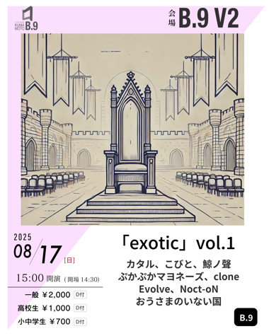「exotic」vol.1 出演:カタル、こびと、鯨ノ聲、ぷかぷかマヨネーズ、clone Evolve、Noct-oN、おうさまのいない国